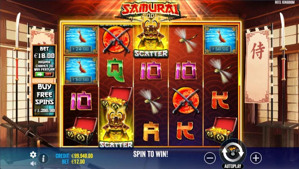 The layout of this game is pretty standard and consists of 5 reels with 12 possible paylines. In most jurisdictions you can also select the Autoplay option when playing Samurai Code. You can choose from 10, 25, 50, 100 or even more spins. You can opt to stop Autoplay on a win, if a single win exceeds a certain amount, or if your balance increases or decreases by a chosen amount. This is a great way to stay in control and to play more responsibly.