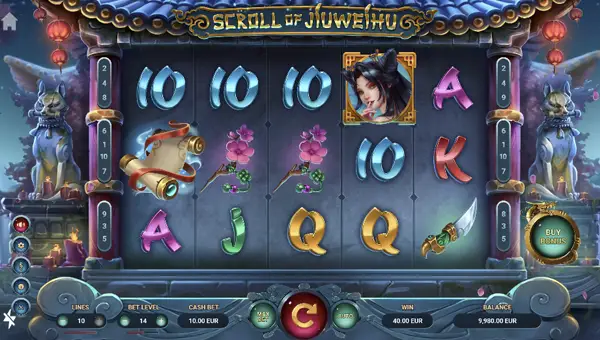 The layout of this game is pretty standard and consists of 5 reels with 10 possible paylines. In most jurisdictions you can also select the Autoplay option when playing Scroll of Jiuweihu. You can choose from 10, 25, 50, 100 or even more spins. You can opt to stop Autoplay on a win, if a single win exceeds a certain amount, or if your balance increases or decreases by a chosen amount. This is a great way to stay in control and to play more responsibly.